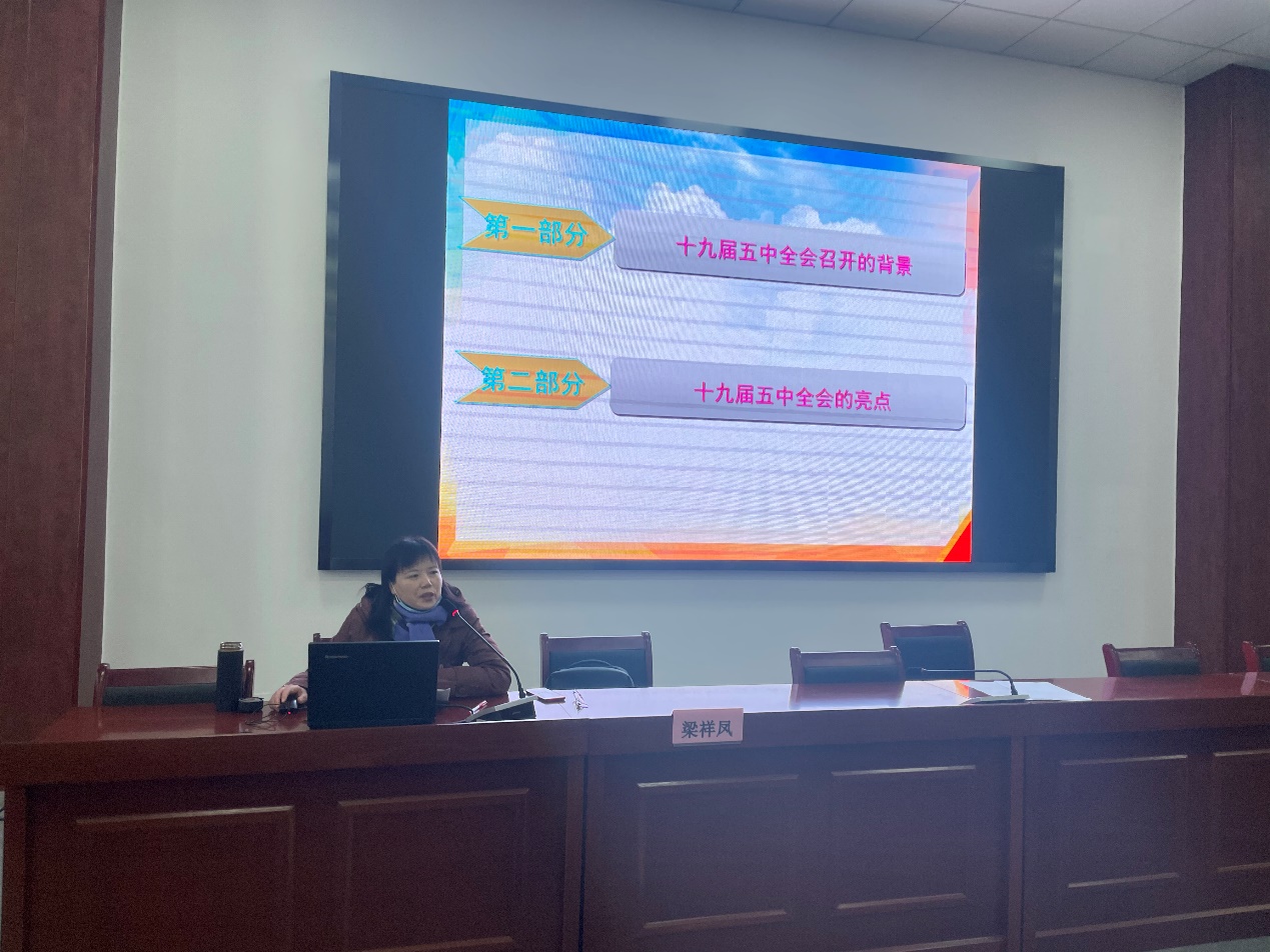 宣讲会上,梁祥凤从党的十九届五中全会召开的背景出发,深入解读了会议亮点内容。党的十九届五中全会是在国内和国际环境发生深刻复杂变化背景下召开的一次重要会议,会议审议通过了《中共中央关于制定国民经济和社会发展第十四个五年规划和二〇三五年远景目标的建议》,梁祥凤重点解读了《建议》中提出的“十四五”时期我国发展的指导方针、主要目标、重点任务、重大举措等相关内容。