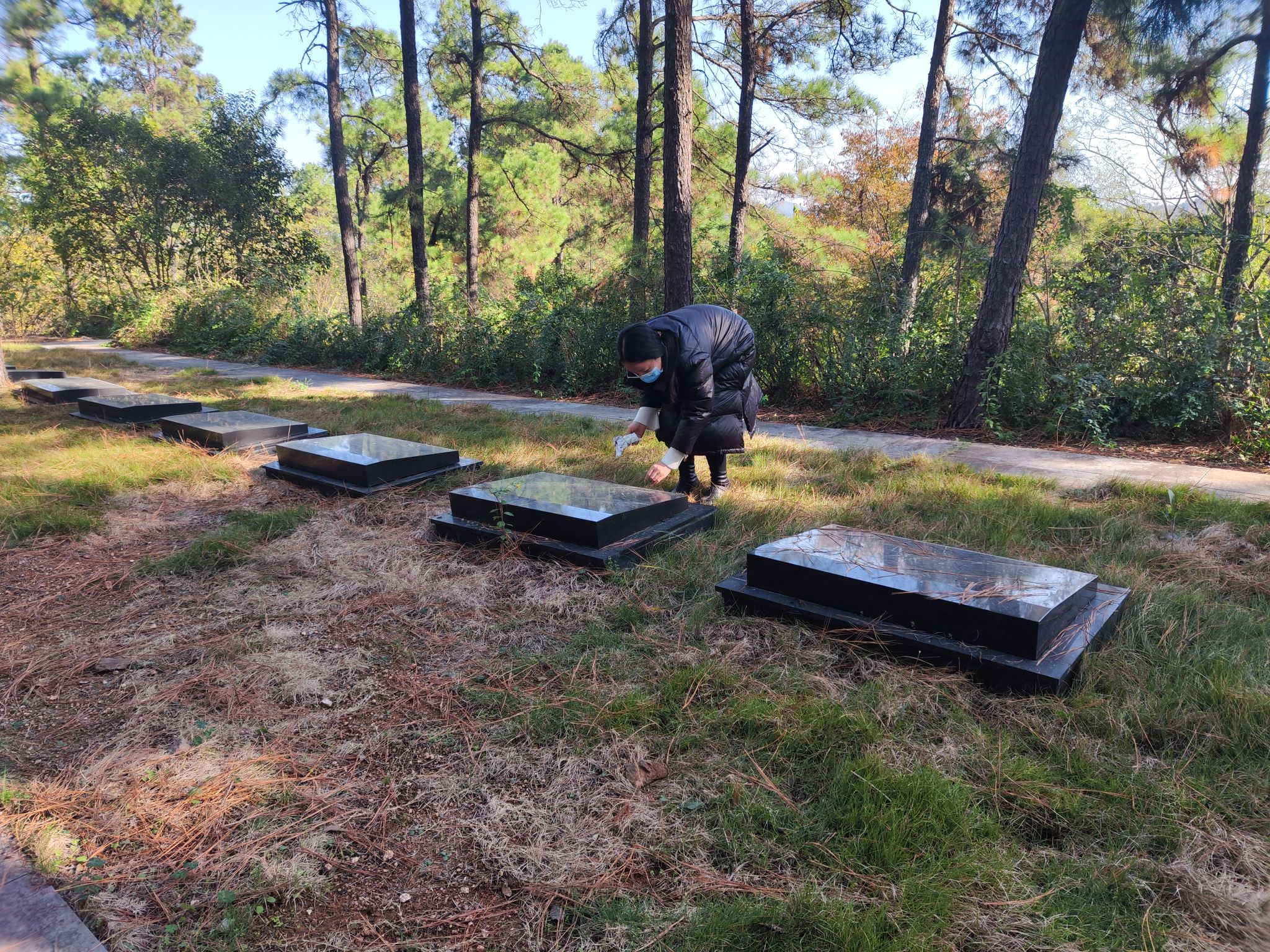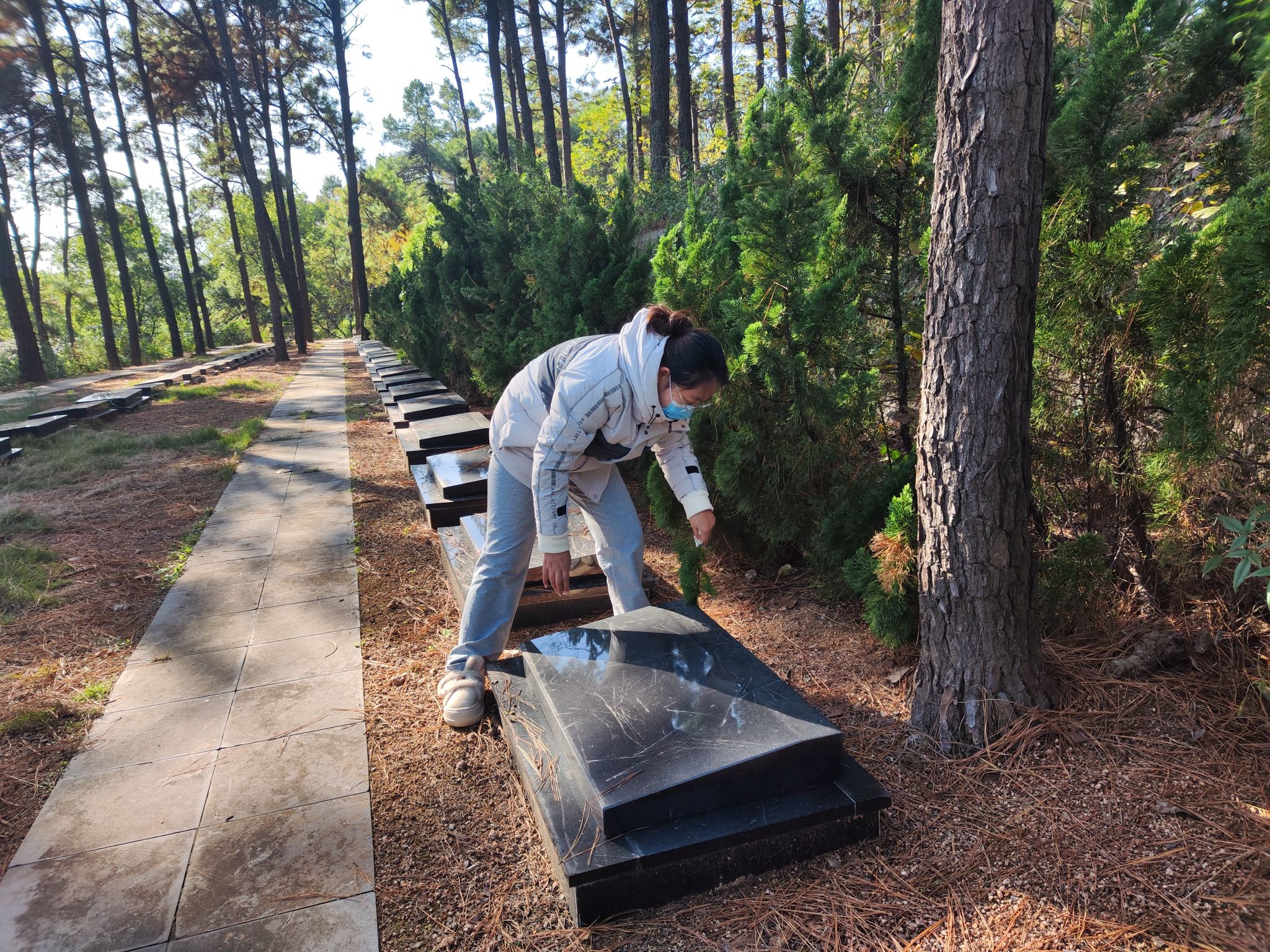 在烈士陵园,同志们排队缓缓前行,现场入党积极分子们用双手仔细清扫每一座烈士的墓碑,清除落叶,除掉杂草,擦去灰尘。从山上下来后,全体员工在烈士英名纪念墙前久久伫立,心中默念着先辈们的英名。
