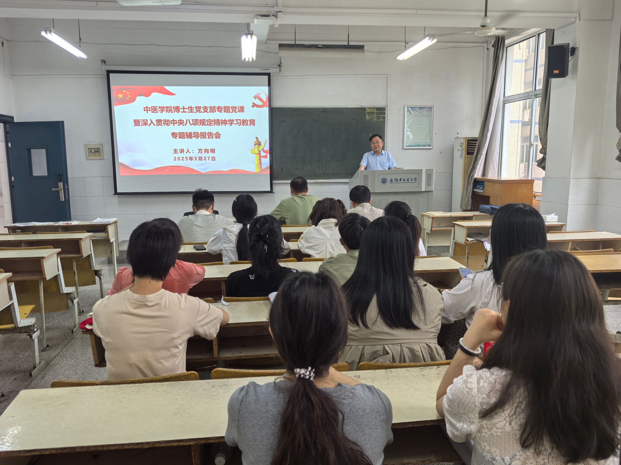 方向明结合《习近平关于加强党的作风建设论述摘编》,以“从徙木立信到化风为俗”为题,从“为什么要制定中央八项规定?”“如何看待中央八项规定?”“怎样锲而不舍贯彻落实中央八项规定精神?”三个方面,结合警示教育案例深入剖析中央八项规定实施以来取得的显著成效。他指出在中医药传承创新过程中,博士生党员既要追求学术卓越,更要锤炼过硬党性修养,并向大家提出三个具体要求:要将制度约束转化为政治自觉,要将纪律要求转化为科研操守,要将廉洁文化转化为育人资源。
