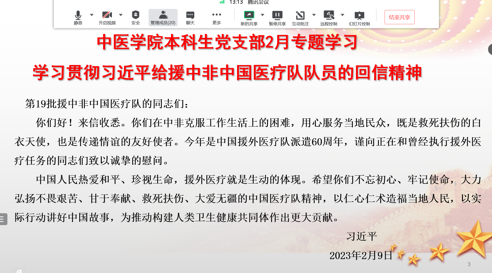 为深入学习宣传贯彻党的二十大精神、纪念中国援外医疗队派遣60周年,2月15日,英国上市公司365本科生党支部利用腾讯会议的方式举行“学习习近平总书记给中非医疗队队员的回信精神”专题学习。