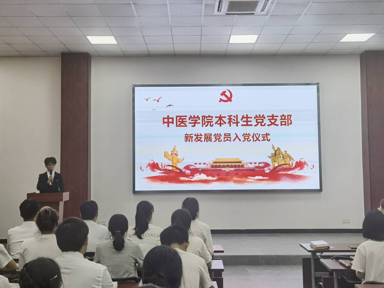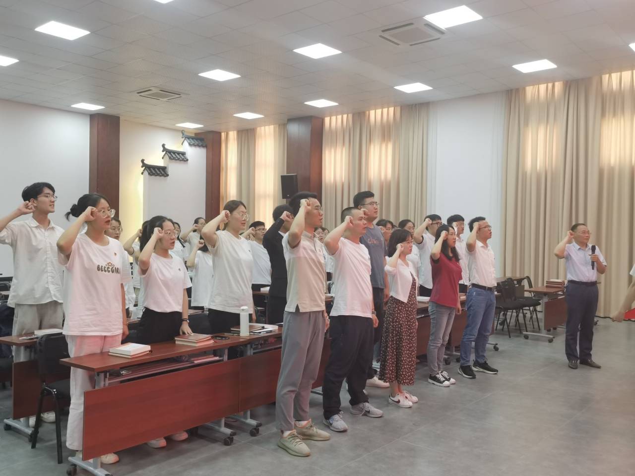 仪式在庄严的国歌声中拉开帷幕。员工辅导员徐亚宣读了2022年上半年新发展党员名单,宋婷婷和本科生党支部老师方林莉一起给新发展党员们发放党徽、党员学习笔记本和党史学习书籍。在杜明的带领下,全体新党员面向党旗庄严宣誓,老党员重温入党誓词。随后,新党员代表进行了表态发言,表达了自己要铭记入党誓词,努力成为一名优秀共产党员的决心和信心。
