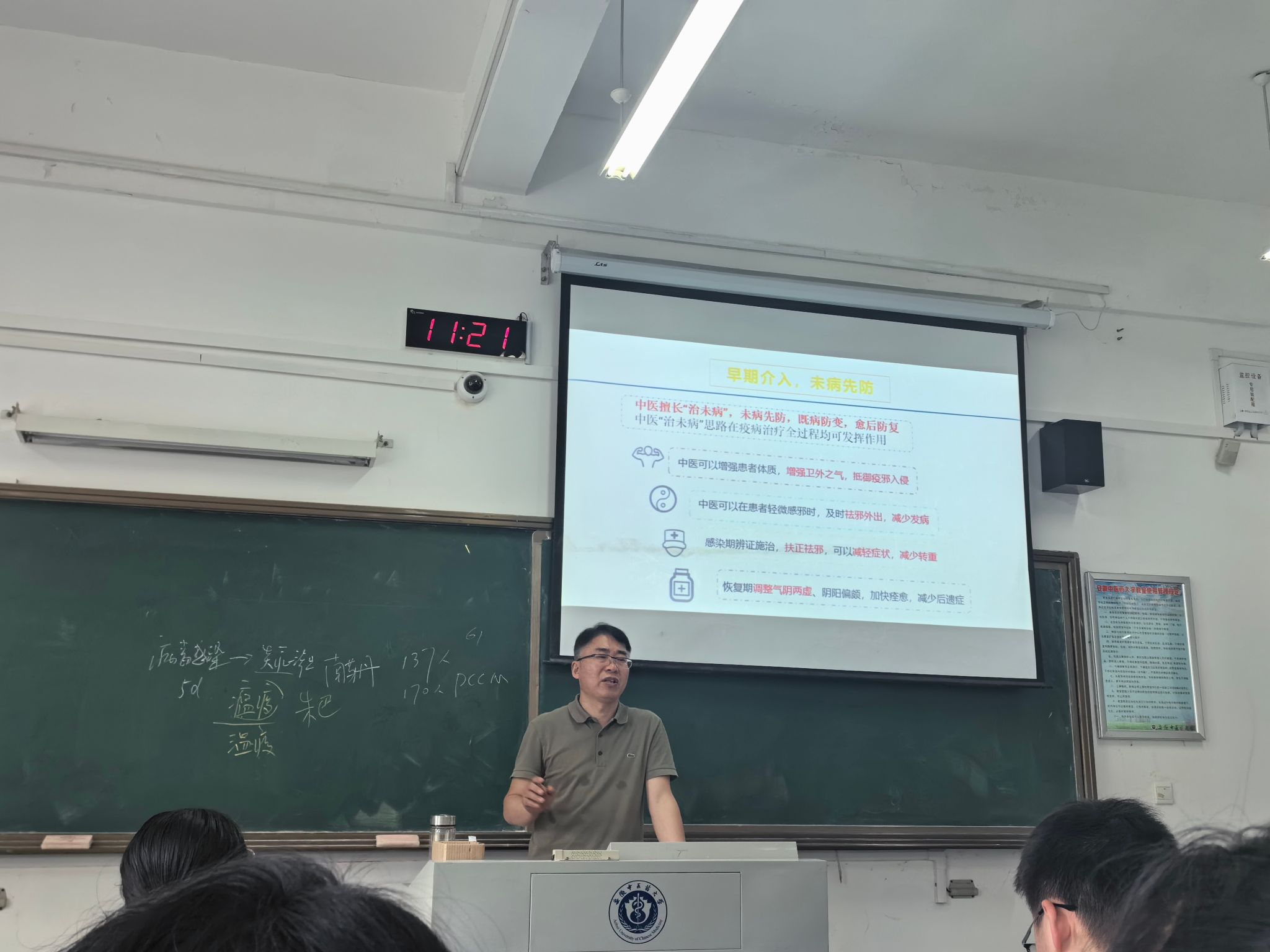5月21日,公司副经理、温病学教学团队童佳兵主任医师在少荃湖校区公共教学B220教室为2021级中医学5+3班就《温病学》课程第十一章“温疫类温病”开展了一次“课程思政”教学示范公开课。公司部分青年教师认真聆听了这堂课。