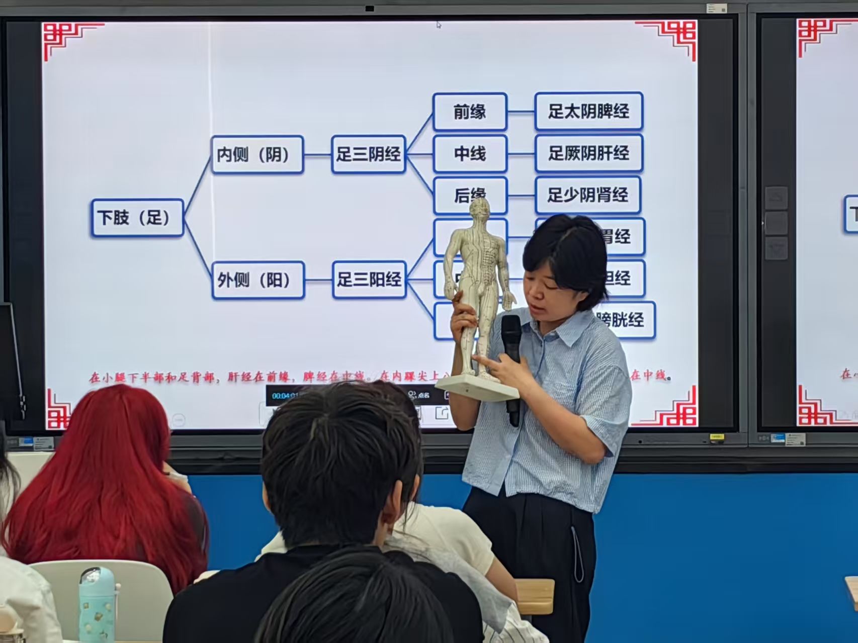 十二经脉的走向规律是核心难点之一。为了让同学们更直观地掌握经脉走向规律,叶老师采用"理论+动态演示+互动体验"的教学模式,帮助员工在身体上准确理解经脉走向。叶老师邀请两位同学上台在身上进行演示,并带领同学们跟练,既增加同学们的课堂参与度,又调动同学们的学习兴趣。