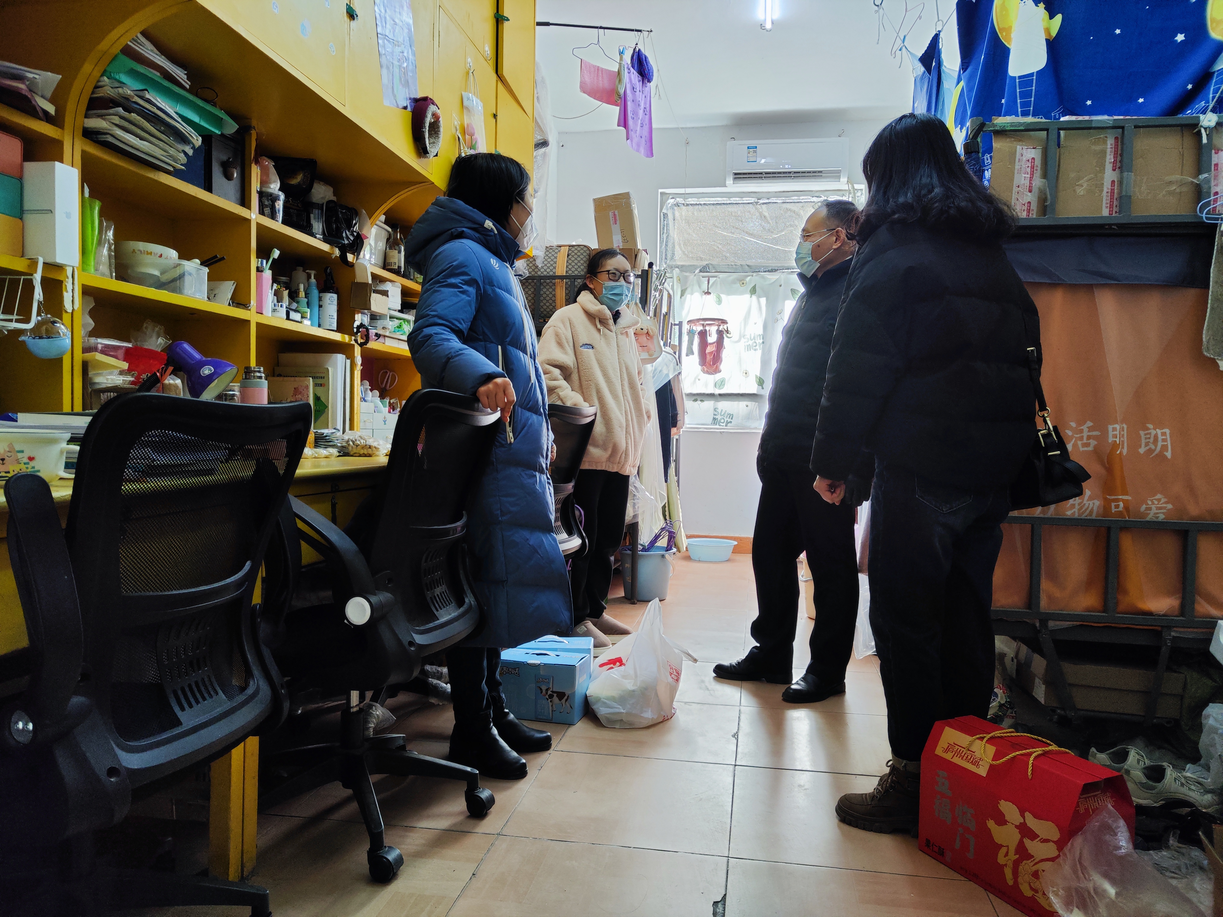 杜明和几位老师一起来到史河路校区员工宿舍,和员工进行了亲切地交谈,详细了解员工目前状况和居住环境,并为员工送上了春节慰问礼品。他嘱咐员工春节期间一定要注意用水用电和人身安全,有任何问题及时和导师、辅导员联系,也要和父母保持联络,让家人放心,同时作为研究生毕业生,也要充分利用假期时间做好毕业和就业相关准备,在新的一年有新的收获。他强调,春节期间导师和辅导员要主动关心关注员工,提供学习、生活和就业等各方面的帮助和指导。