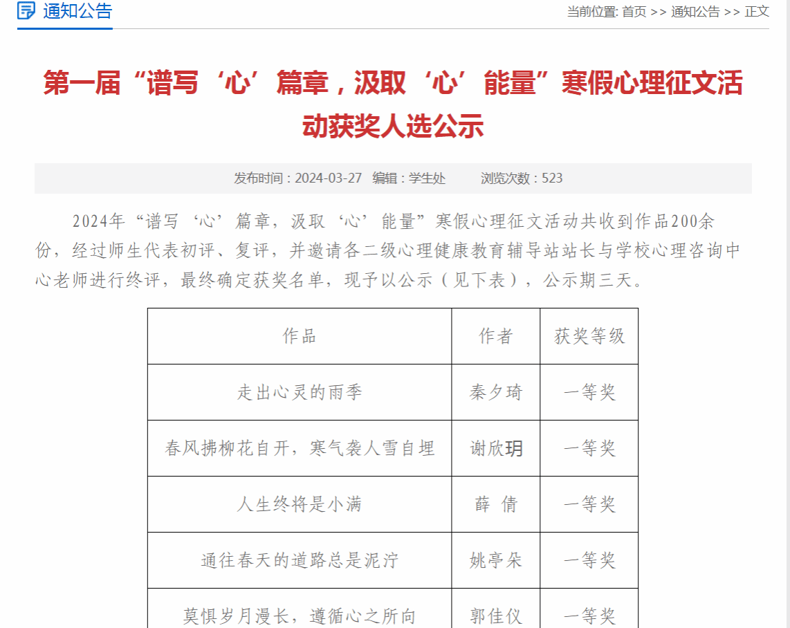 本次大赛以“谱写‘心’篇章,汲取‘心’能量”为主题,旨在丰富公司老员工假期心理健康教育实践活动,增强员工心理健康意识,营造和谐健康、积极向上的校园氛围。经过师生代表初评、复评,并邀请各二级心理健康教育辅导站站长与公司心理咨询中心老师进行终评,最终确定一等奖5名,二等奖10名,三等奖10名。其中,公司研究生员工薛倩同学取得一等奖,研究生李真同学获得三等奖。