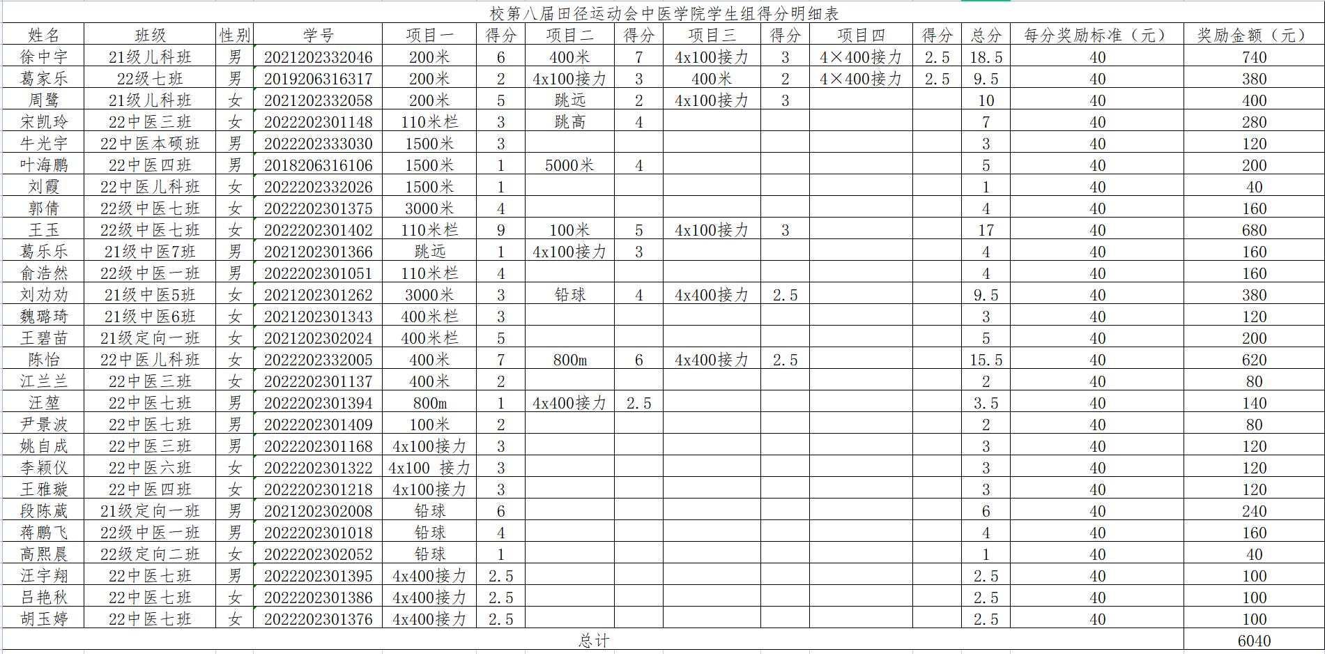徐中宇等27名运动员在英国正版365官方网站第八届田径运动会中取得优异成绩,为表彰先进,弘扬体育精神,激发员工积极性,经公司党委研究决定,按每人每积分40元的发放标准,对获奖运动员给予奖励。徐中宇等27名同学的运动会获奖及奖金发放情况如下,现在全院范围内予以公示。(附明细表格)