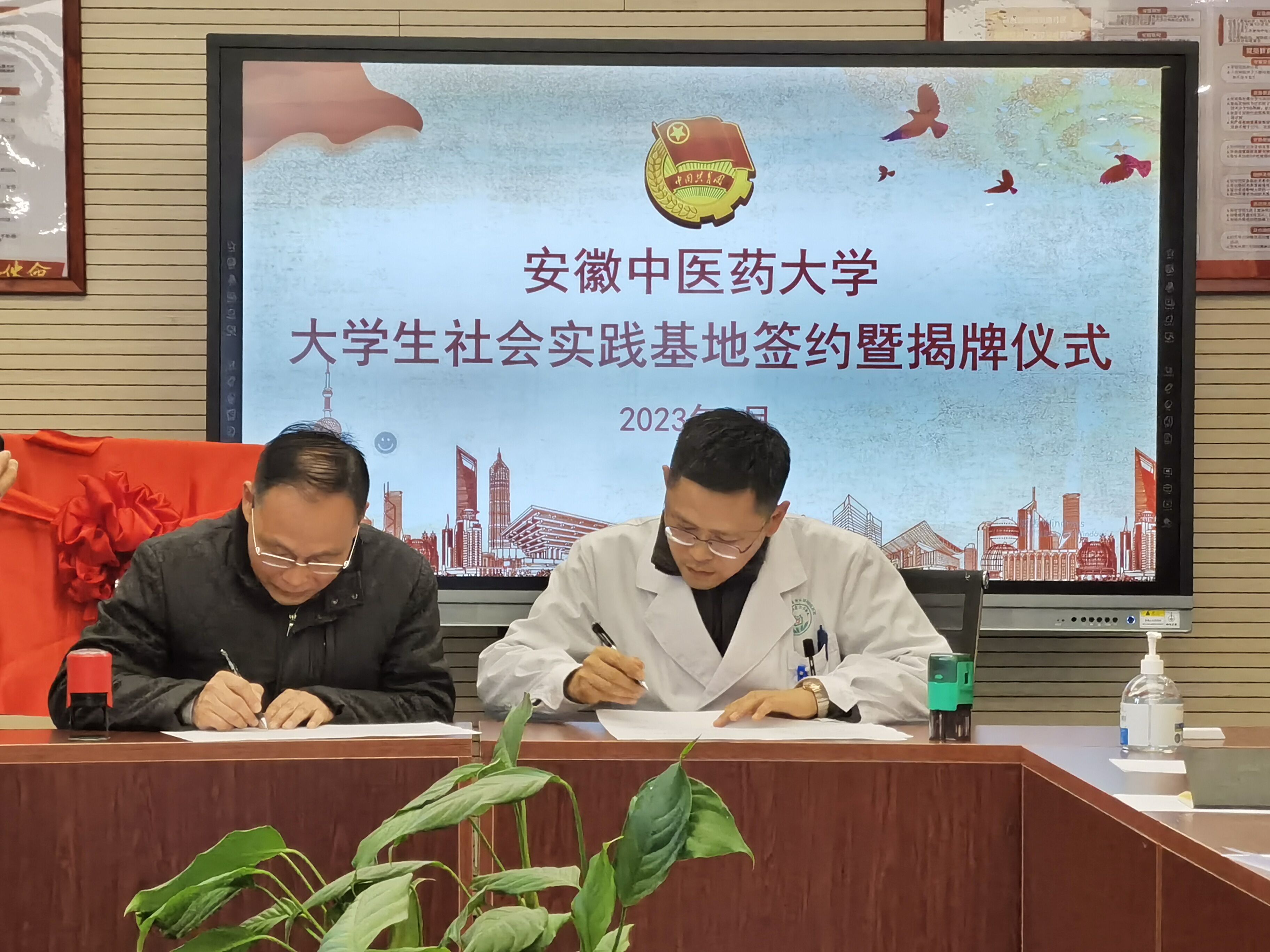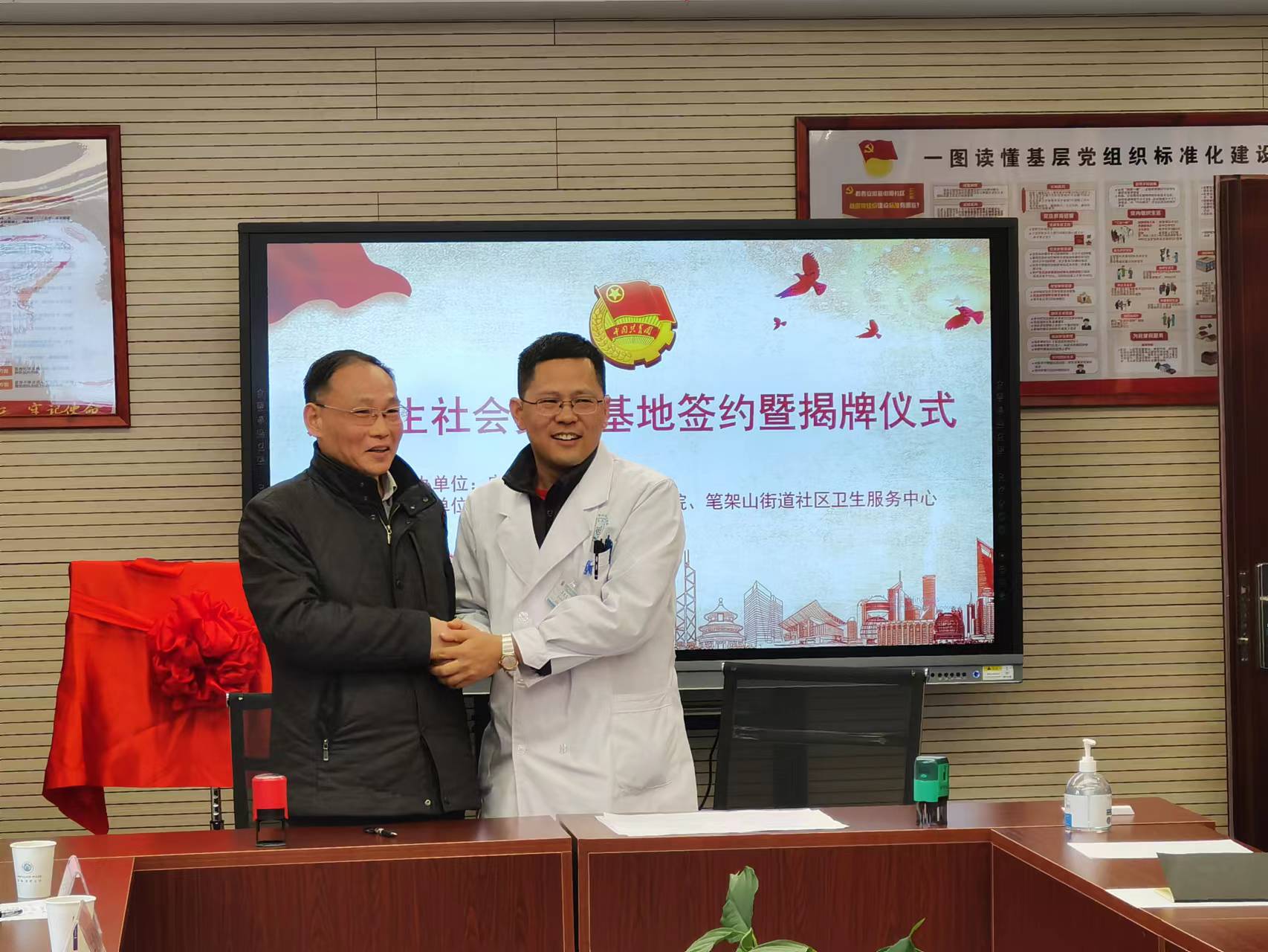 杜明与李忠志签订英国正版365官方网站、笔架山街道社区卫生服务中心老员工社会实践基地合作共建协议书并为“英国正版365官方网站老员工社会实践基地”揭牌。