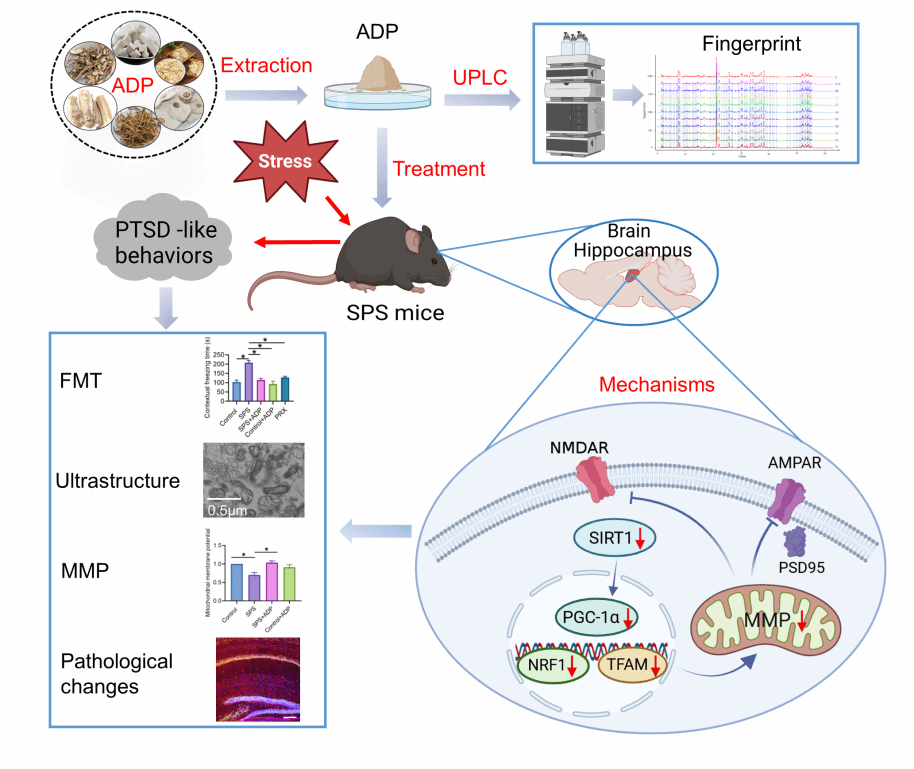 创伤后应激障碍(Post-traumatic stress disorder,PTSD)是一种突然经历或目睹心理创伤或灾难性事件而引起的精神障碍,恐惧泛化是PTSD的核心表型。安神定志方始载于清代中医名著《医学心悟》,是新安医学的代表方之一。本研究表明由SPS引发的恐惧泛化和焦虑样行为可导致SIRT1-PGC-1α依赖的线粒体功能障碍,安神定志方可能通过激活该信号通路改善PTSD样行为,为新安名方安神定志方应用转化奠定基础。(王训翠/文图 方晓/审核)