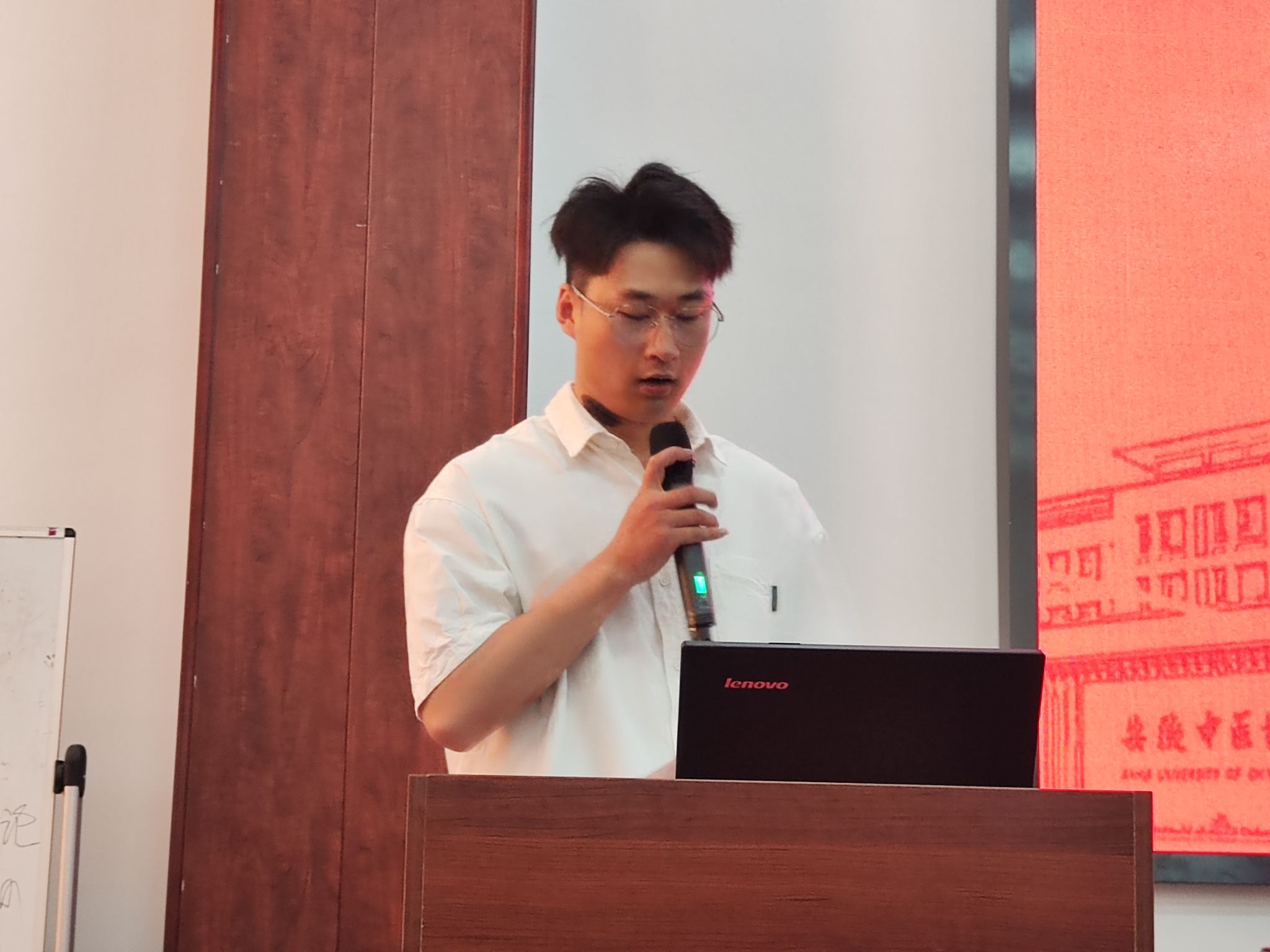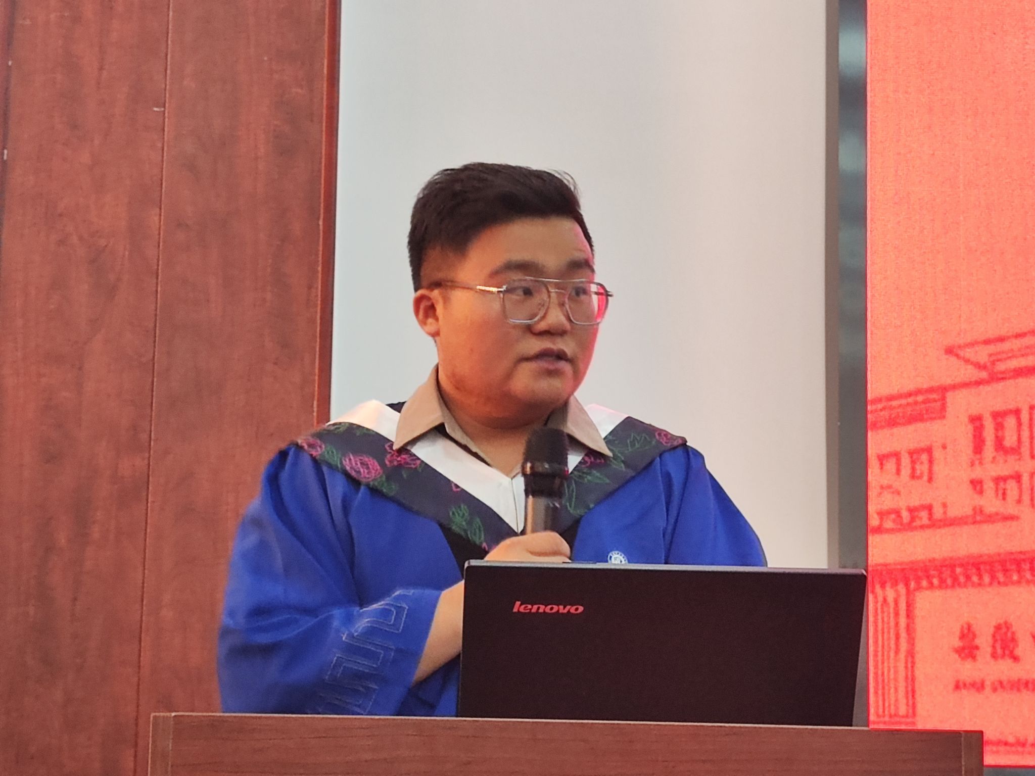 在校生代表梅博扬同学首先代表公司在校生向即将毕业离校的师兄师姐们送上最真挚的祝福,他认为研究生生活是一段难忘的时光,这里既有挑战也有收获,他特别感谢在过去的两年中师兄师姐在学术上或是生活中对低年级研究生的帮助与提携,最后他希望师兄师姐们能够依旧勇敢面对挑战,敢于担当,保持对知识的热爱和对生活的热情,不断学习、不断进步,勇往直前。