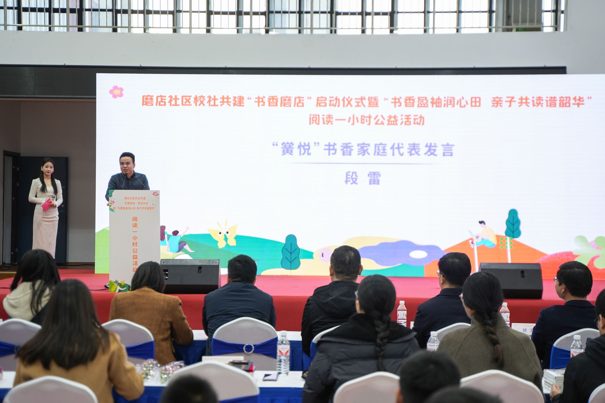 11月26日,磨店社区校社共建“书香磨店”启动仪式暨“书香盈袖润心田 亲子共读谱韶华”阅读一小时公益活动正式启动。本次活动在园上园小学学府路校区体育馆举行,由新站区党政办、党建工作部、社会发展局、新站区文明办共同主办,磨店社区党群工作部等承办,公司青年教师段雷作为“黉悦”书香家庭参加,并作为代表发言。