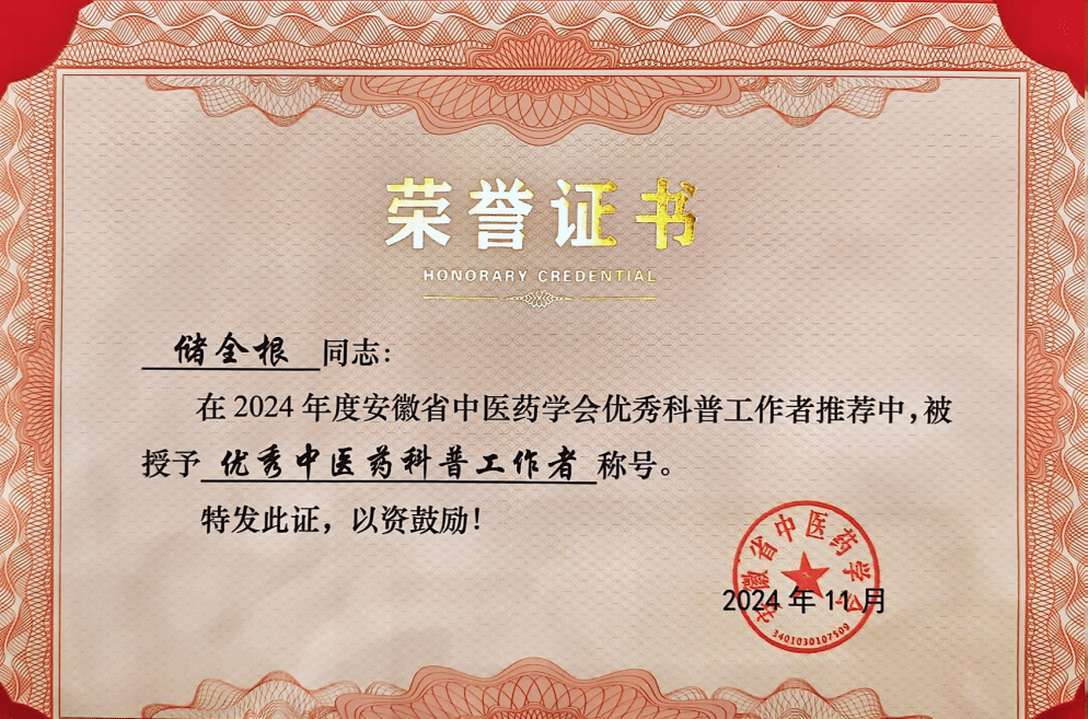 11月30日,安徽省中医药学会2024年学术年会暨长三角中医药发展大会如期召开,根据《关于开展2024年度安徽省中医药学会评选优秀中医药科普工作者的通知》(皖中会〔2024〕35号),学会经过逐级推荐、专家评审等环节,最终表彰了10名“中医药科普工作者”,公司储全根教授获此荣誉。(段雷/文图 方晓/审核)