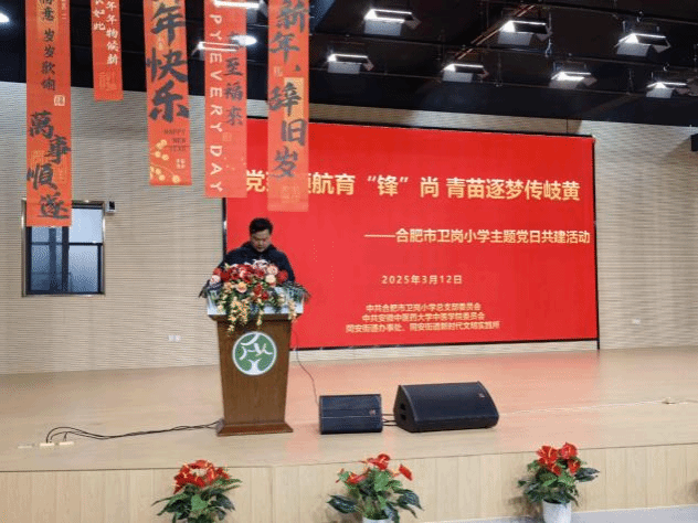 3月12日,公司党委与合肥市卫岗小学及同安街道党工委联合举办了“党建领航育锋尚 青苗逐梦传岐黄”主题党日活动。此次活动以党建引领为核心,深度融合中医药文化传承与青少年实践教育,通过知识科普、节目表演及互动交流等形式展开。公司叶敏老师、庆兆老师及部分员工代表,同安街道党工委领导,卫岗小学相关领导及少先队员代表等百余人共同参与了此次活动。活动在卫岗小学报告厅拉开帷幕。