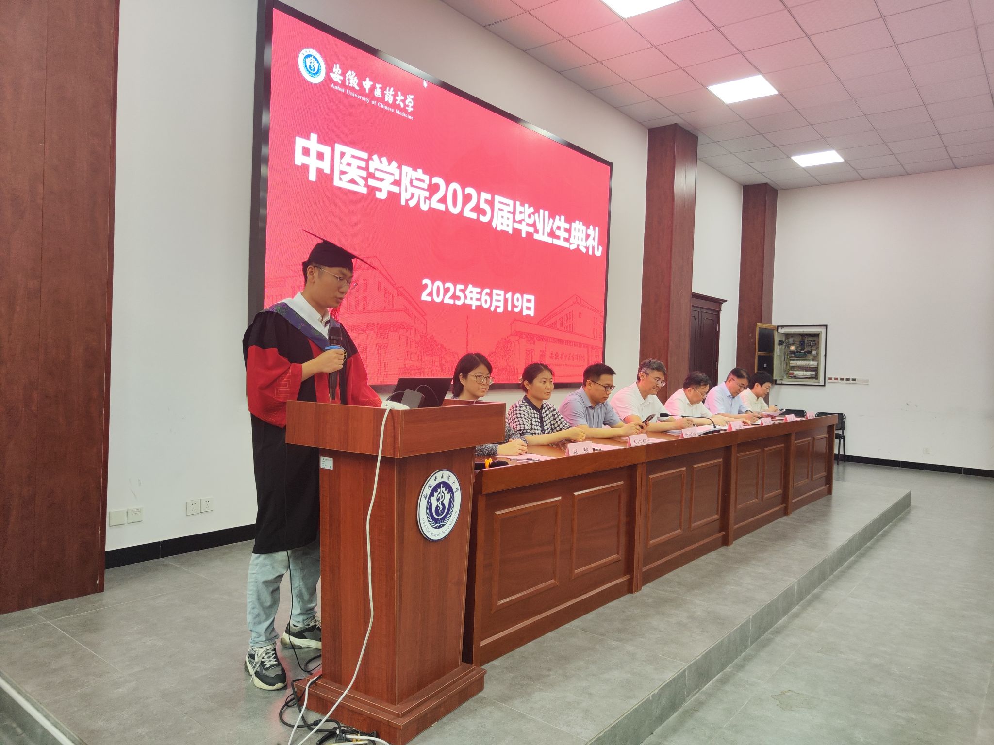 硕士毕业生代表梅博扬同样感慨万千,他分享了这三年研究生生活中的难忘点滴,同学们从实验室里的日夜钻研到临床实践中的成长蜕变,这些经历都将成为人生中宝贵的财富。他衷心祝愿母校蓬勃发展,桃李满天下。