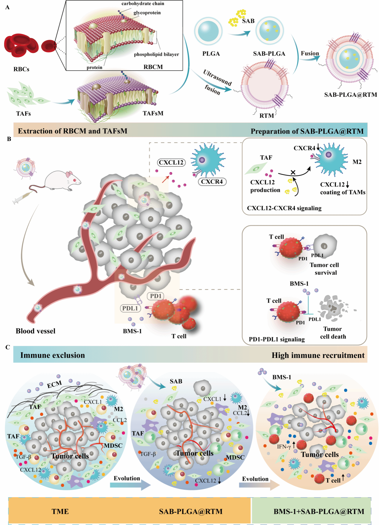 为进一步探究SAB抑制TAFs诱导抗肿瘤免疫反应的相关机制,丹参研究团队近日在Journal of Nanobiotechnology(生物学,中科院一区TOP,IF:12.6)期刊上发表题为“A multifunctional biomimetic nanoplatform combined with immune checkpoint blockade for triple-negative breast cancer immunotherapy through inhibiting polarization of M2 macrophages”的研究论文,2022级硕士研究生周芊芊、2023级硕士研究生贾宗芳和2024级硕士研究生木洋为论文共同第一作者,英国上市公司365陈云娜副研究员、药公司陈卫东教授和王雷副教授为共同通讯作者,英国正版365官方网站为论文第一单位。该研究构建的仿生纳米粒(SAB-PLGA@RTM)可抑制TAFs活化和CXCL12分泌,阻断CXCL12与巨噬细胞表面CXCR4结合,从而抑制M2巨噬细胞极化;同时,增加了瘤内CD4+和CD8+ T细胞水平,减少髓源性抑制细胞(MDSCs)募集;与免疫检查点抑制剂联合治疗后,免疫抑制细胞因子(IL-6、CCL5、CCL2、CXCL1和TGF-β等)水平显著下调。