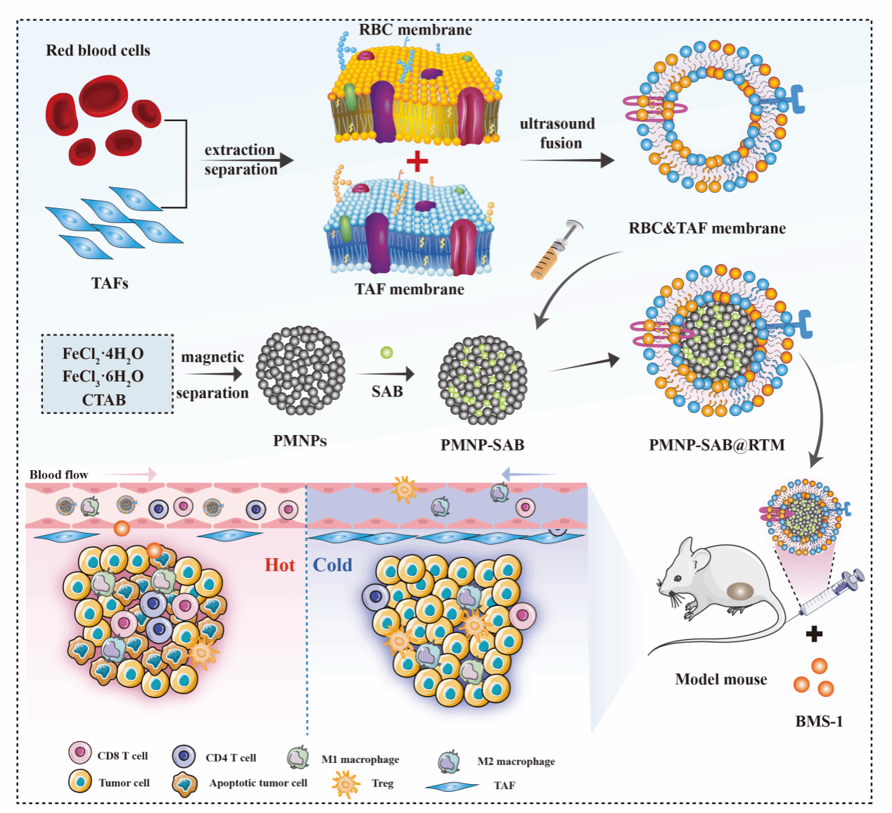 近日,公司英国上市公司365丹参研究团队在Materials Today Bio(医学,中科院一区TOP,IF=10.2)期刊发表题为“Functionalized biomimetic nanoparticles loaded with salvianolic acid B for synergistic targeted triple-negative breast cancer treatment”的研究论文,2021级硕士研究生程诺、2022级硕士研究生周芊芊和2023级硕士研究生贾宗芳为论文共同第一作者,英国上市公司365陈云娜副研究员、张盛副研究员和药公司王雷副教授为共同通讯作者,英国正版365官方网站为论文第一单位。该研究基于“冷”-“热”微环境转化治疗策略,构建了红细胞和肿瘤相关成纤维细胞(TAFs)混合细胞膜包被的多孔磁性纳米粒(PMNPs)用于递送丹酚酸B(SAB),实现“免疫逃逸”和“同源靶向”双重作用。通过磁场作用,SAB可靶向聚集肿瘤部位;瘤内释放的SAB能有效抑制TAFs产生细胞外基质,促进T细胞浸润,诱导抗肿瘤免疫反应。