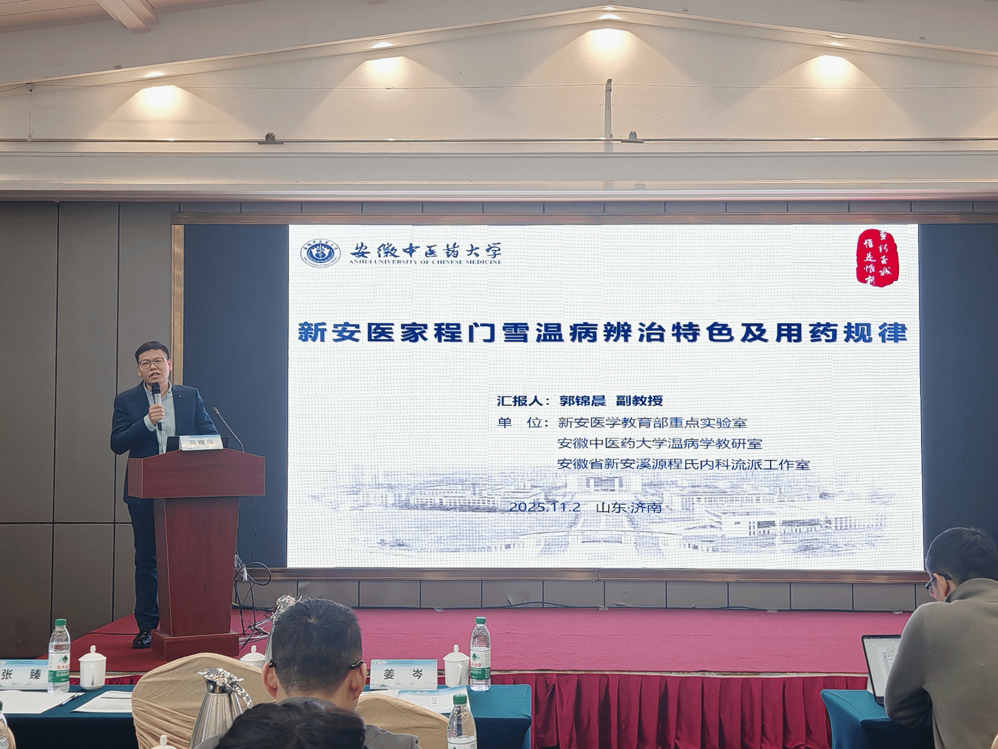 在大会上,郭锦晨副教授作了题为《新安医家程门雪温病辨治特色及用药规律》的专题报告,从程氏内科传承脉络、程门雪温病辨治特色、程门雪温病用药规律、程门雪温病验案举隅等方面向与会专家介绍了新安医家程门雪温病临证特色。程门雪是古徽州婺源人,是新安温病学派的杰出代表医家,早年师从新安伤寒大家汪莲石与孟河名医丁甘仁,曾任上海英国上市公司365首任经理,主张融合伤寒与温病学说,倡导寒温统一,临床用药以轻灵平稳见长,善用复方多法治疗内外科疾病。