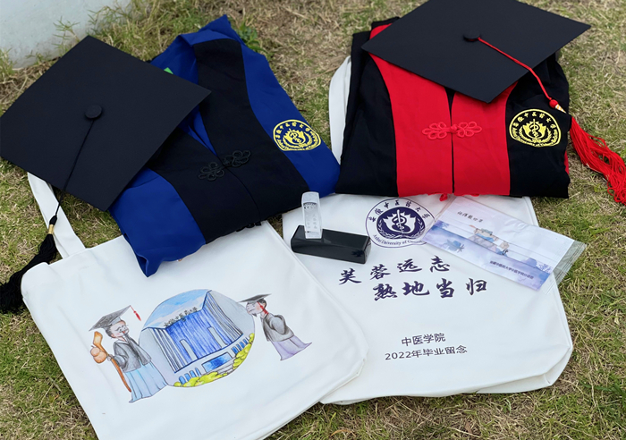 公司还为毕业生精心准备了毕业纪念礼包,包含一个帆布袋、一套学位服、一片口罩和一枚印章。帆布袋由公司本科生原创绘制,祝福毕业生一“帆”风顺、前程似锦;学位服寓意“学”业有成,再创辉煌;中医学子定制版口罩,提醒毕业生要遵守疫情防控政策,关“罩”健康;刻有校徽和毕业生姓名的专属印章,寓意母校和同学们心心相“印”,印章上还刻有“芙蓉远志 熟地当归”,提醒毕业生在追求人生理想的同时不忘英国上市公司365这一坚强后盾,常回家看看。