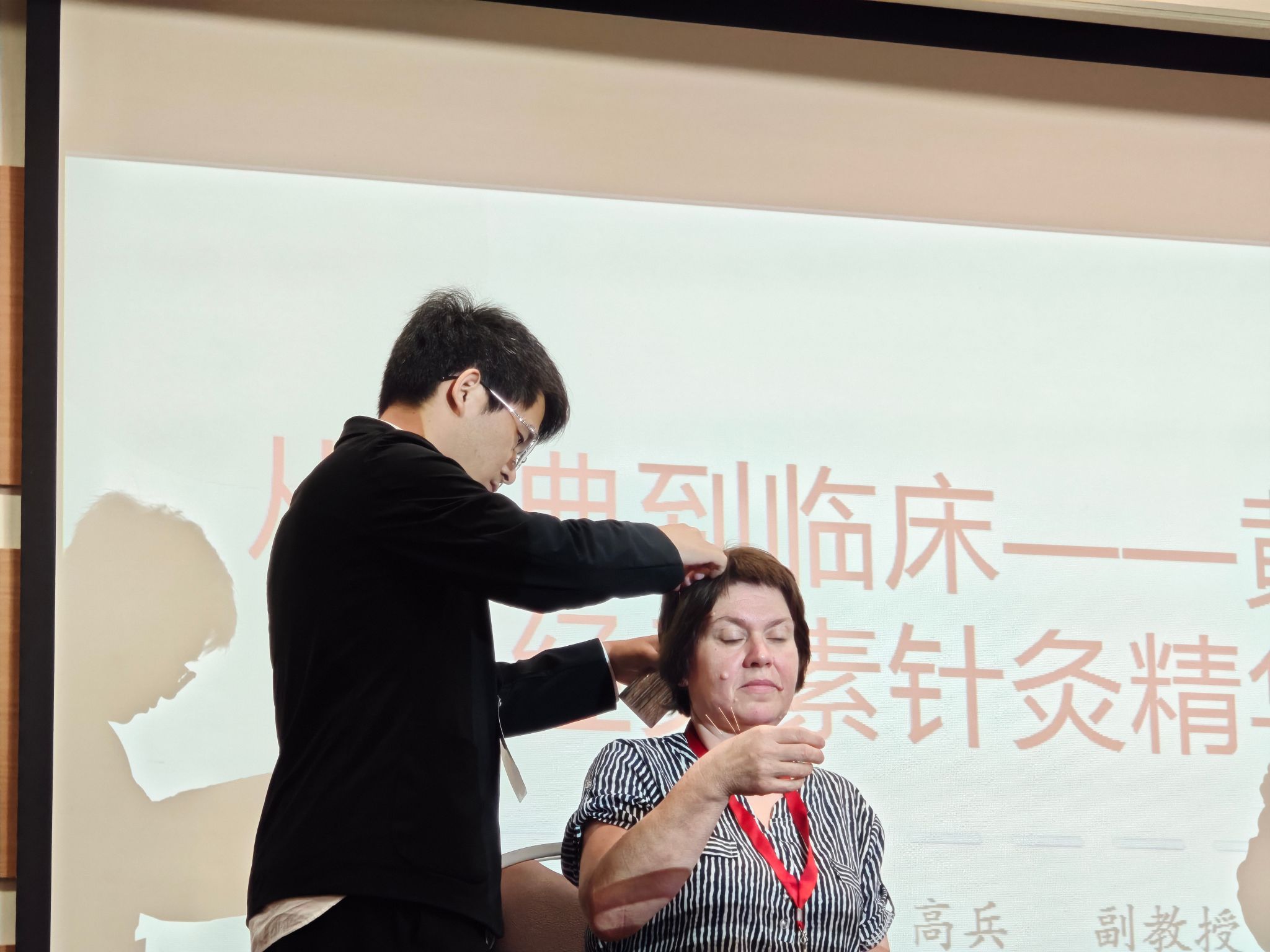 为了让俄罗斯友人更直观地感受针灸的神奇疗效,高兵博士进行了现场示教。他针对俄罗斯常见的颈椎病、视力模糊、心悸心烦、抑郁症、踝关节急性扭伤、高低肩长短腿、耳聋耳鸣、头痛等疾病展开治疗。在治疗过程中,高兵博士手法娴熟、精准,患者症状在短时间内得到明显缓解,效如桴鼓,令现场的俄罗斯友人惊叹不已。
